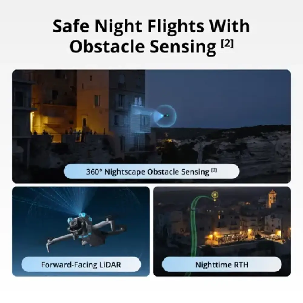 بفضل تقنية LiDAR الأمامية، يكتشف Mini 5 Pro العوائق، مثل المباني الشاهقة، حتى في ظروف الإضاءة المنخفضة، ويتحرك بذكاء للأعلى، مما يضمن عودة أكثر أمانًا أثناء الطيران الليلي.